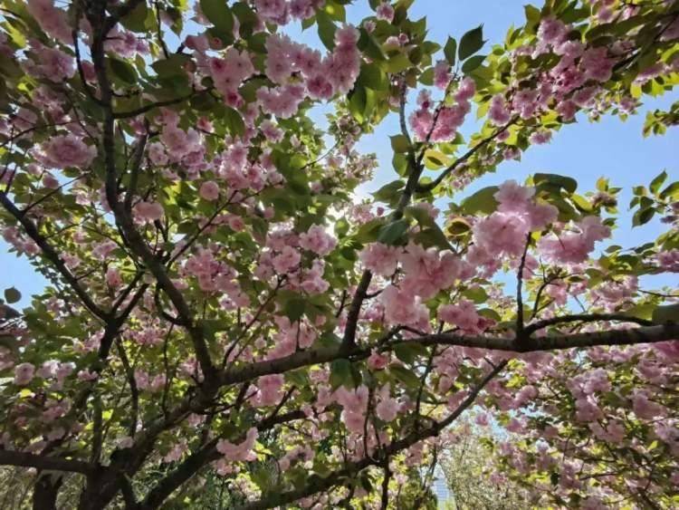 等到早樱落尽,晚樱迅速迎来一波大规模的爆花期,让人有一种时光倒流的感觉,似乎春天重新来了一遍,樱花季再次开始。接力的关山樱花朵硕大浓艳,繁花簇拥压低枝头,抬头仰望,花儿朵朵,展示着春日里的热烈明媚。