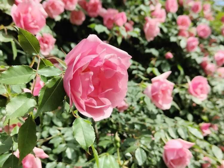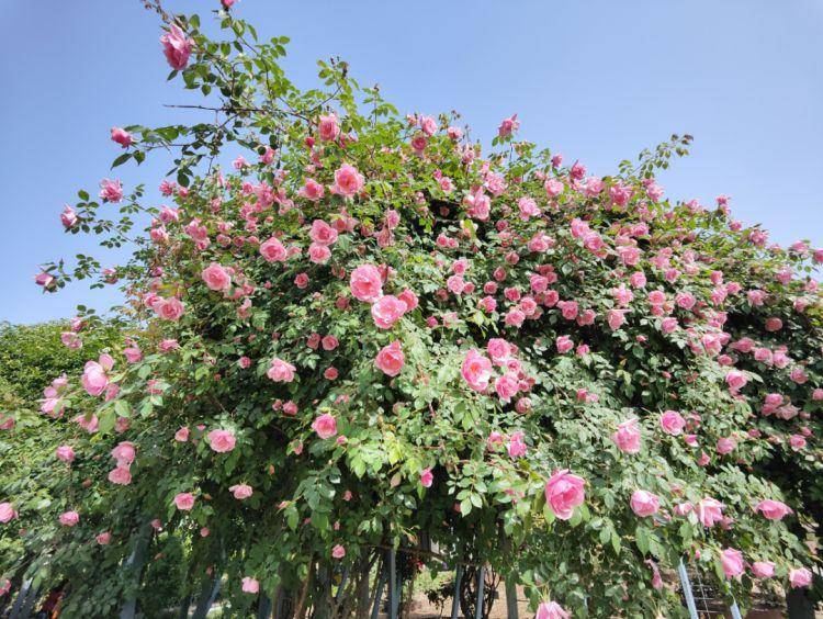 走进蔷薇园,远远就能看见,廊式的蔷薇棚架上,深浅不一的粉红花朵点缀其间,引得不少市民驻足拍照打卡。蔷薇花的花季很长,从晚春到初夏,蔷薇花开携着春的浪漫而来,连春接夏,又带有初夏的清凉和从容。“菱透浮萍绿锦波,夏莺千啭弄蔷薇”是蔷薇花开明亮的笑脸,“深院下帘人昼寝,红蔷薇架绿芭蕉”是蔷薇花清光轻逝,岁月静好的温柔。