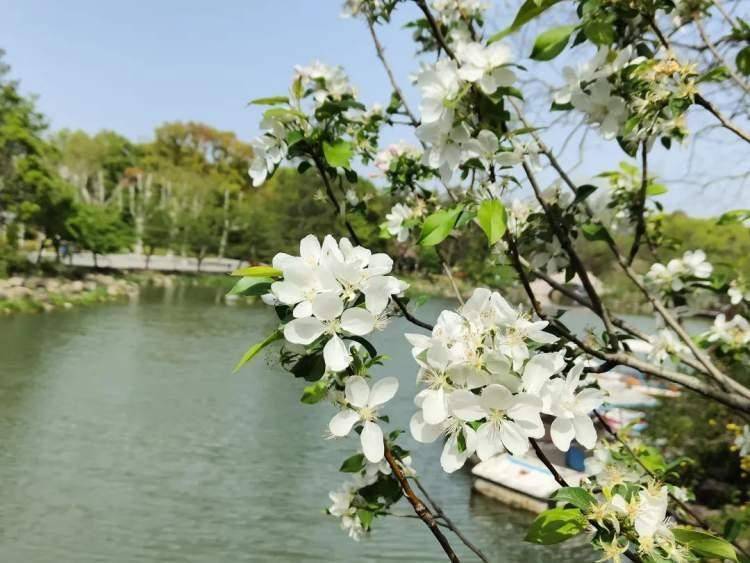 在海棠园内,记者看到,八棱海棠迎风开放,一枝枝、一串串的海棠花俏立枝头,似胭脂点点,明媚动人。踏青的市民们不时停下脚步欣赏拍照,留下这美丽的瞬间。