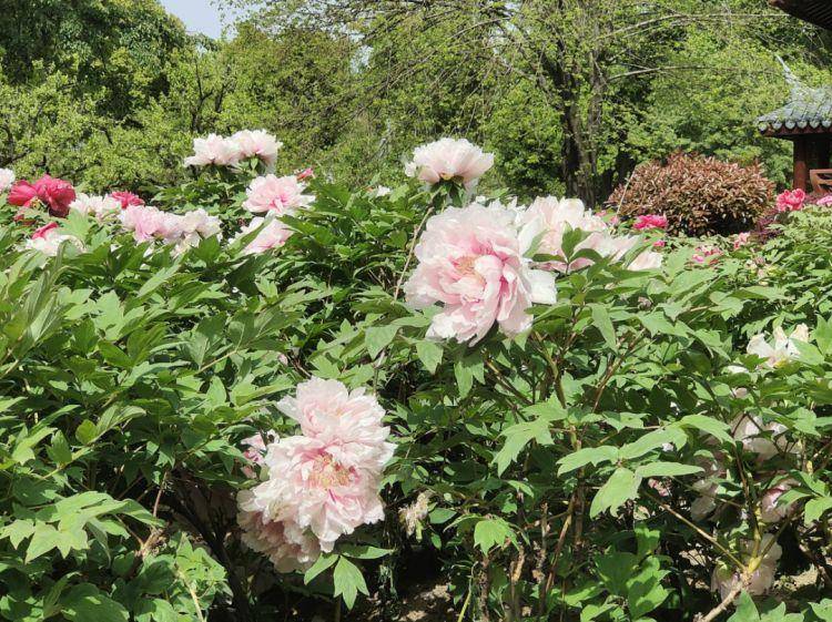 在牡丹园,盛开的牡丹花,白的似雪、粉的若霞,娇艳飘逸、香气袭人,不远处的牡丹亭和长廊更是衬得姹紫嫣红中带着一点古风古韵,微风拂过,花枝轻颤,柔美如斯。