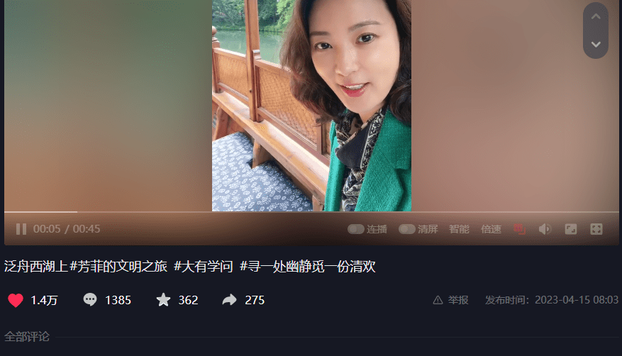 与此同时,刘芳菲还晒出了一则时长达00:45秒的短视频,该视频系刘芳菲泛舟西湖的休闲画面,下面就让我们一起跟随刘芳菲的镜头来看看此次到到访杭州都有哪些值得关注的亮点之处: