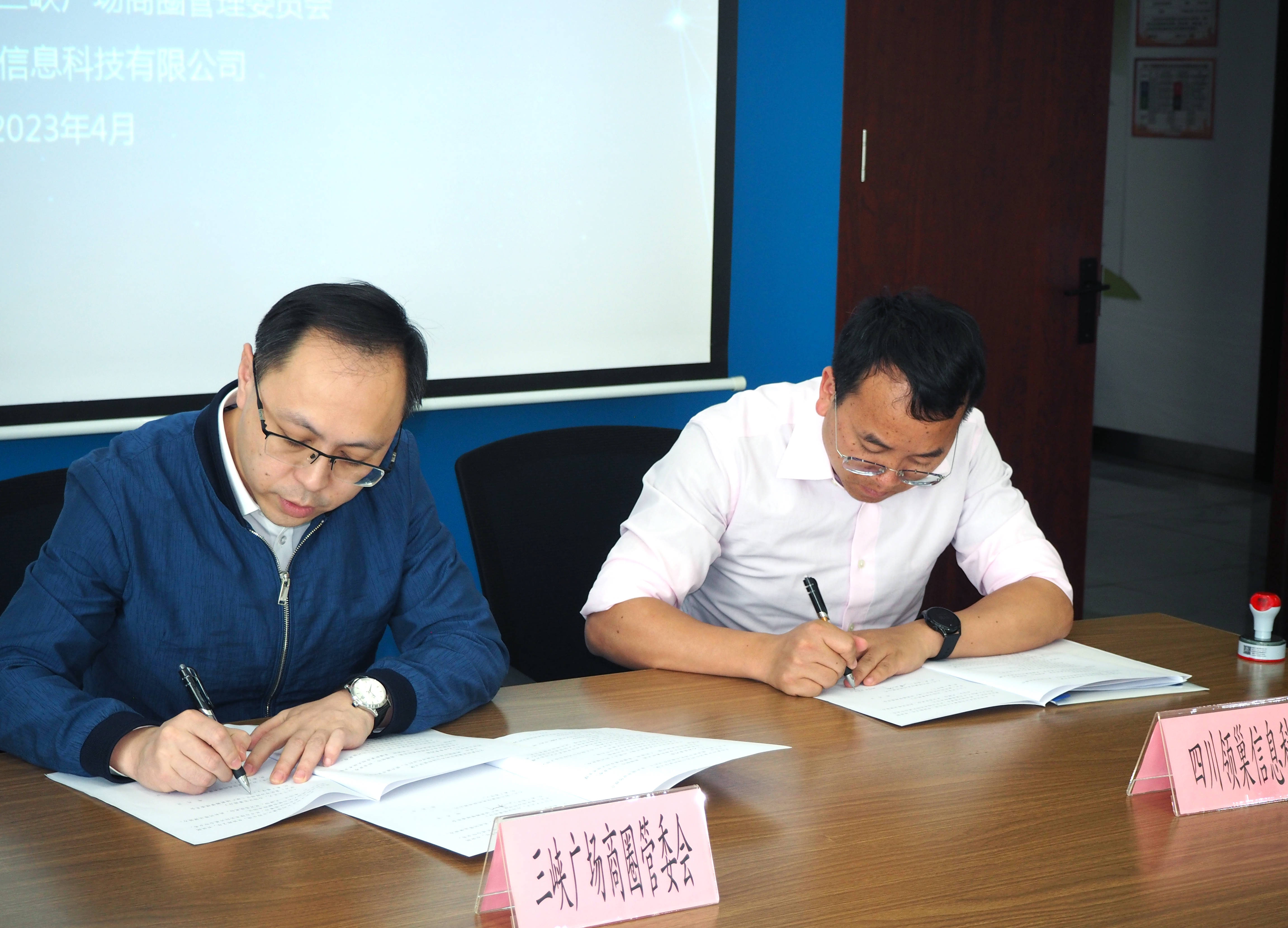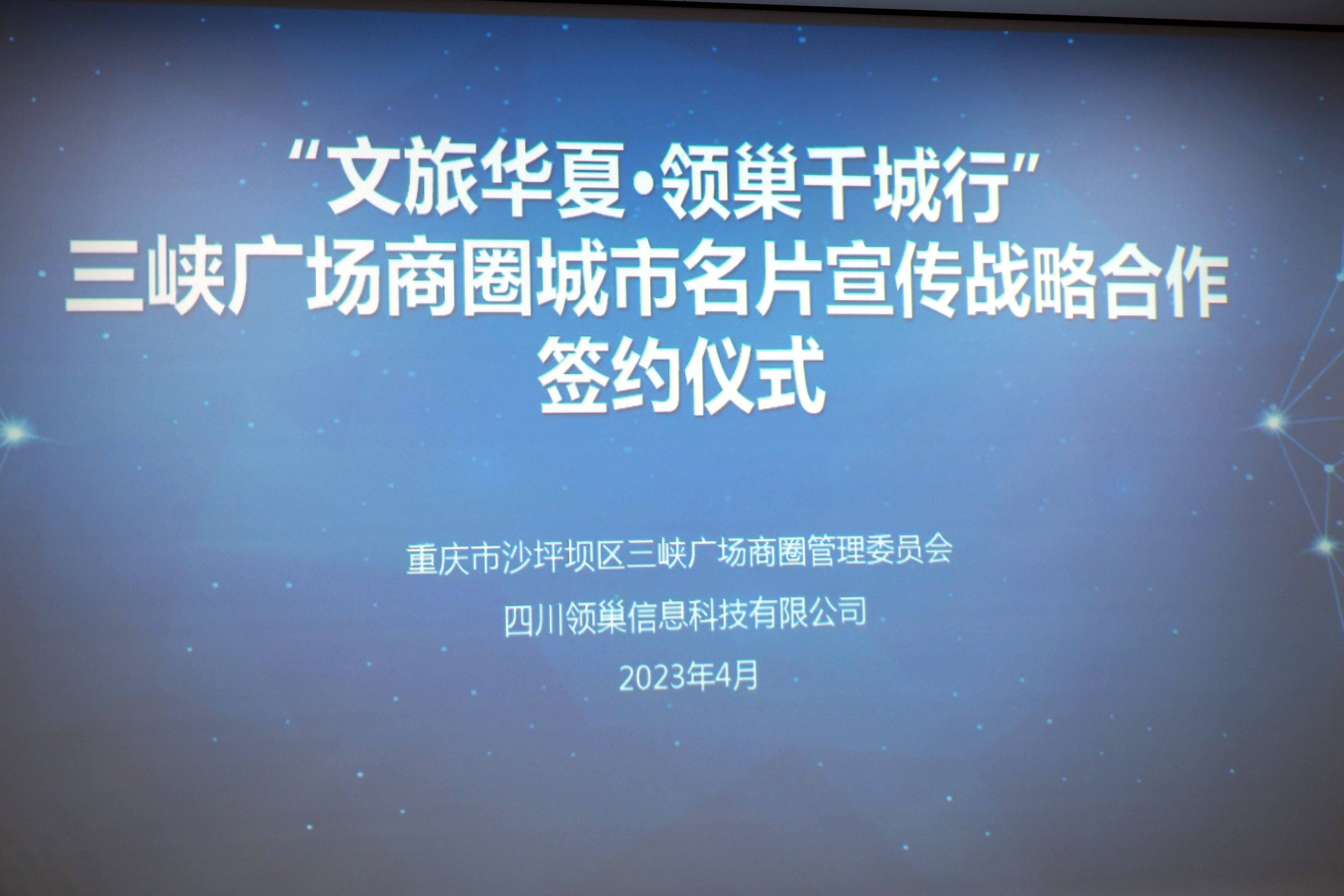 本网讯(许江涛报道):2023年4月14日,重庆沙坪坝三峡广场商圈管委会会议室里,随着三峡广场商圈管委会常务副主任朱晓村,与四川领巢信息科技有限公司董事长李定侨,在沙坪坝区三峡广场商圈城市名片宣传推介战略合作框架协议上庄严签字,开启了“文旅华夏•领巢千城行”落户重庆,进一步提升沙坪坝商圈城市名片影响力的进程。