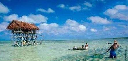 基里巴斯经济落后,被联合国列为最不发达国家之一。政府利用其跨国际日起变更线,发展旅游业。基里巴斯大部分岛屿都面临着被海水淹没的危险,根据环境保护科学家预计,50年后基里巴斯将全部被海水淹没。图为首都南塔拉瓦一个村落的居民在涨潮淹没这个区域时蹚水离开家,直到退潮后才能回去