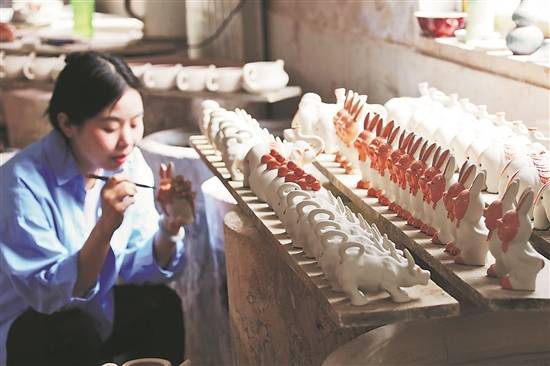 4月12日,在禹州市神垕古镇一家钧瓷企业,一位员工为钧瓷素胎上釉色。
