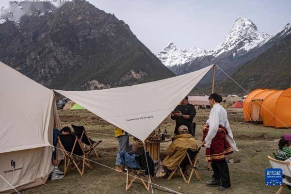 4月15日,游客在巴松措附近体验露营生活。