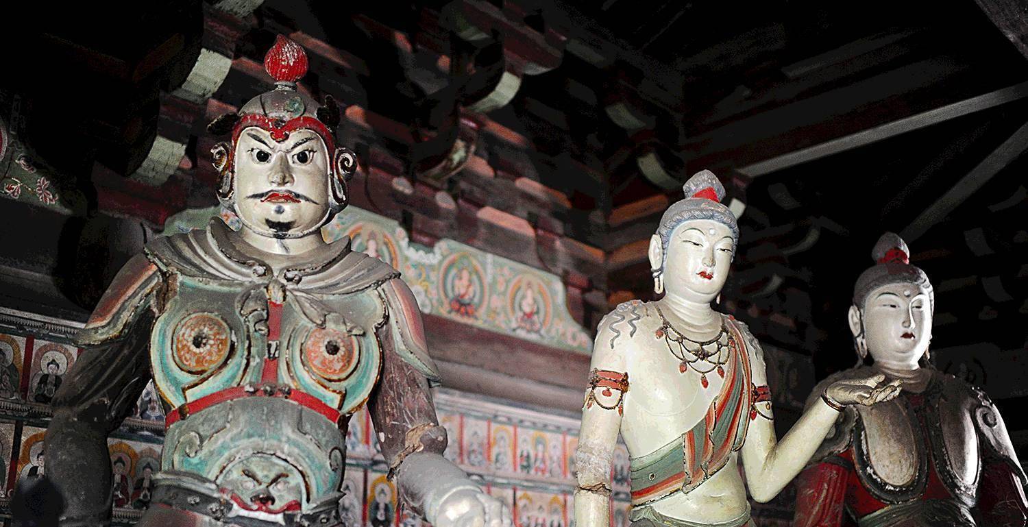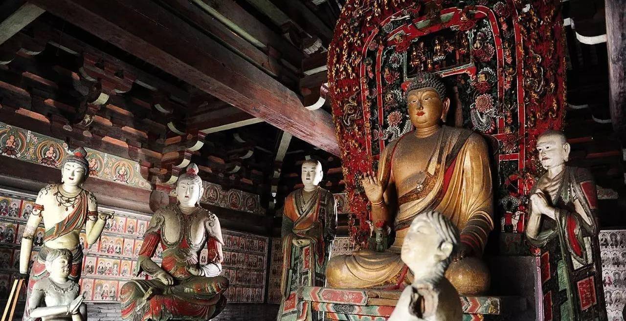 除此结构以外,万佛殿中也有很大的看点,这里拥有着研究价值较高的壁画和佛像,其中主要供奉的是释迦牟尼像,是五代所作,身神慈祥,造型高大,气势很是不凡,周边墙壁还有一些佛像彩绘围绕着展开,看起来十分紧凑,形态动作也不尽相同,但是神色严肃自然,充满虔诚之感,可以让感受到一种视觉上带来的震撼之感,因此用万佛殿命名。值得一说的是,这里的五代彩塑像,全国寺庙里除了敦煌莫高窟中有少量外就没有了,因此才格外的珍贵。
