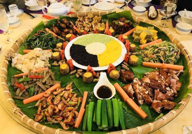 说到吃,在呀诺达,还有个很值得吃的,那就是黎家宴。黎家宴是黎族人特有的一种宴客方式,用簸箕装上三色饭和各种菜肴,配以蔬菜水果,给人一种视觉盛宴。在这里吃黎家宴,也是一种享受。你能清楚地说出这些菜都是什么菜吗?