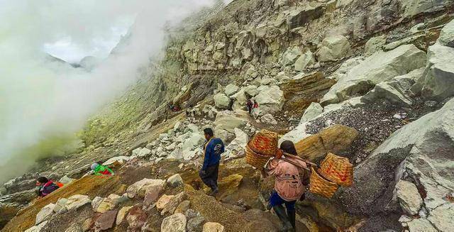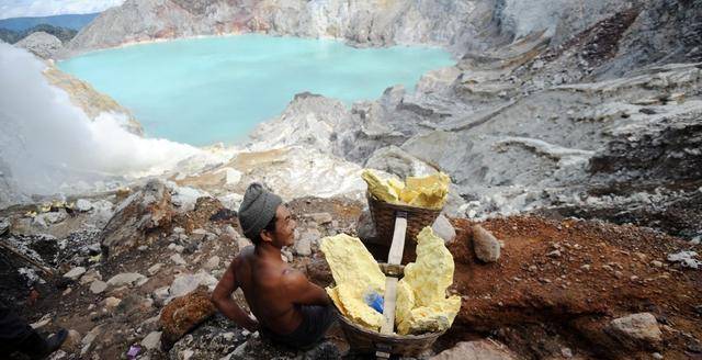 但就是这么一个恶劣的生存环境,却常有人冒死进去“淘金”,这些人其实都是伊真火山周边的当地居民,印度尼西亚虽说是一个是农业大国,但是经济却不怎么发达,而卡瓦伊真火山喷出的的硫磺矿质好量多,是爪哇岛的支柱性产业,这些人大多是在没有防护的情况下采矿,很多人一大早便要爬上陡峭山坡,进入火山口,冒着跌入火山口及吸入毒烟的危险,用双手、用肩膀去搬出这些硫磺,常年闻着硫磺散发出来的独特臭鸡蛋味道,在硫磺浓烟中往返于硫磺场与称量处。