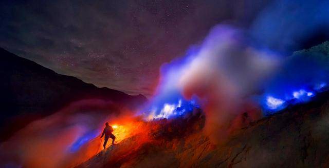 而越靠近蓝色火焰,硫磺味就越重越刺鼻,味道越难闻,大家如果想象不出那滋味的话,可以脑补一下把头埋在成千上万颗发臭鸡蛋里面的感觉。这也是为什么这里被誉为是“世界上最臭的地方”。在被火山折磨着的同时,这里的火山旅游也在造福着这些硫磺矿工,现在当地很多人都在从事旅游业,卖硫磺工艺品,或者当人力车夫拉游客上山,远远要比挖矿更安全,也赚得更多。