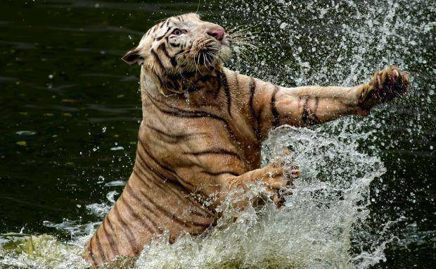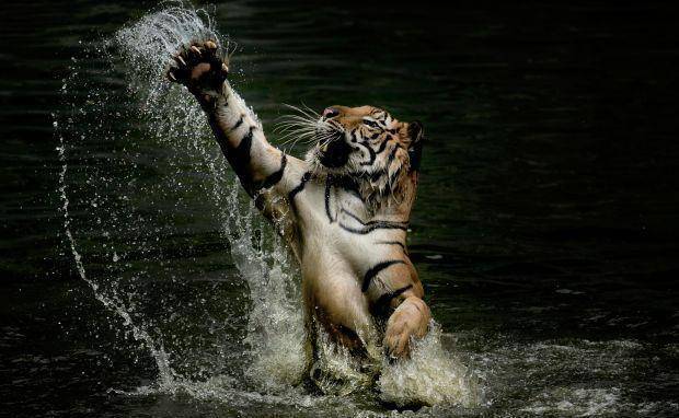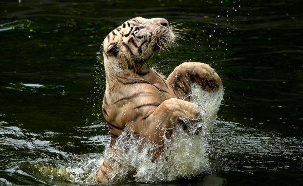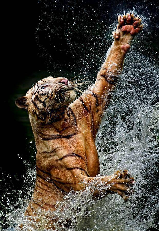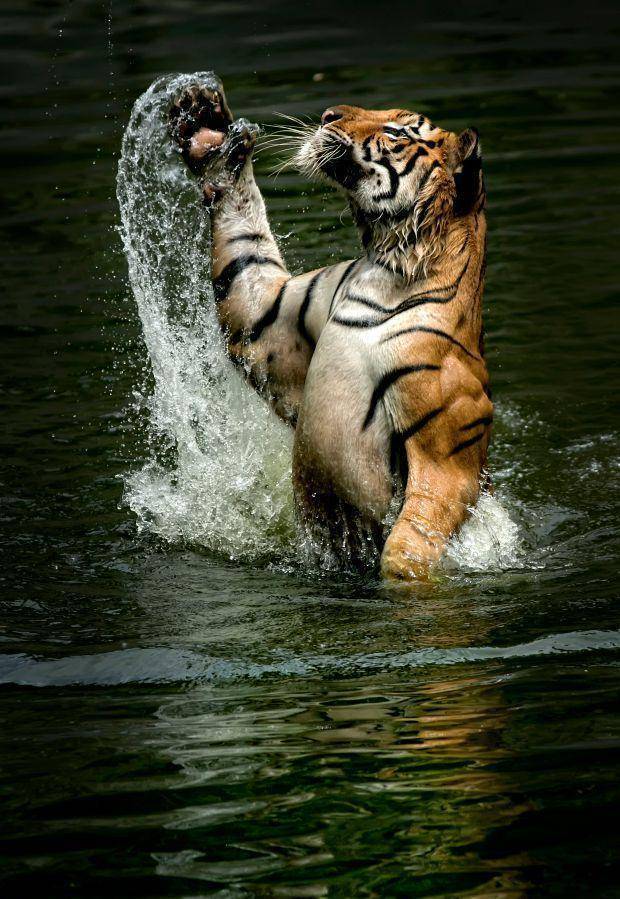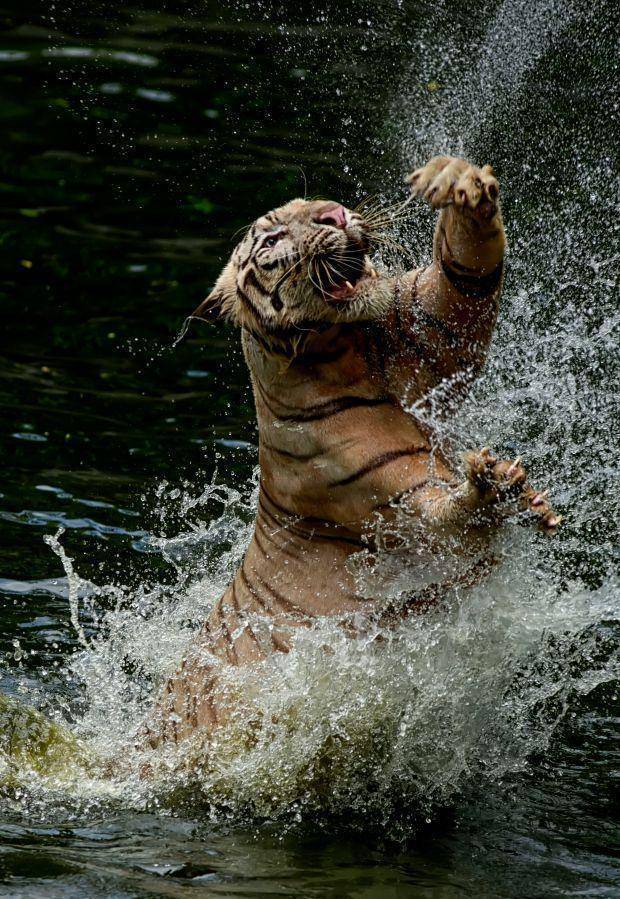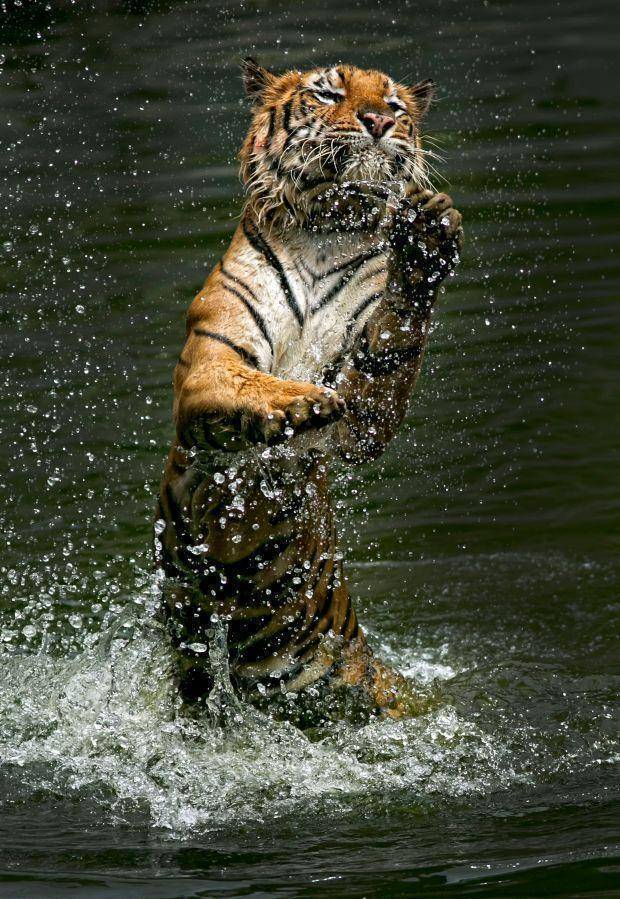 这只苏门答腊老虎,突然间就站立在了水中,前爪向高空伸过去,并前后大幅度地摇摆,然后,又将整个身子反扑上了水面,就像在乞讨吃的,然后,猛地发现了美食一般。