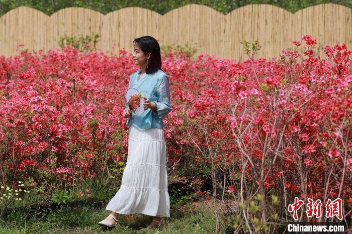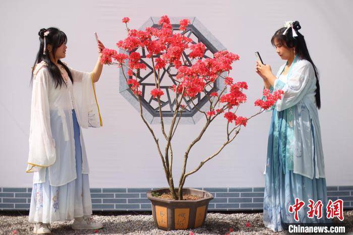 身着古装的姑娘拍摄杜鹃花盆景。 泱波 摄