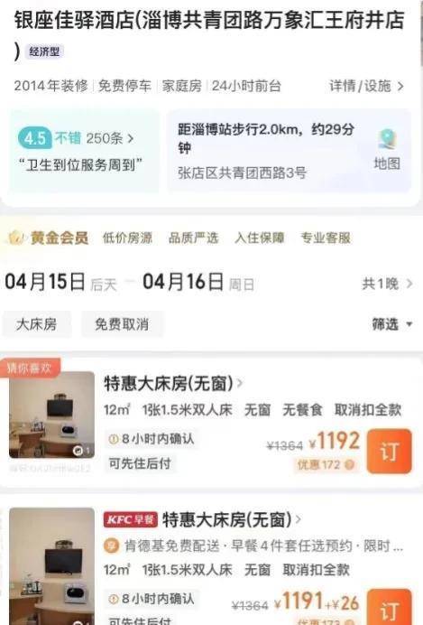 淄博烧烤的爆火,导致搜索量同比去年增长了700%,同时五一假期酒店的预订量同比上涨了800%。但是有网友爆料,平时100左右的经济型酒店,在预定平台上却达到了千元。以银座佳驿酒店的经济型酒店为例,无窗的特惠大床房一晚的价格达到了1192元,而标准大床房却达到了1209元。涨价幅度如此之高,让人感觉离谱。