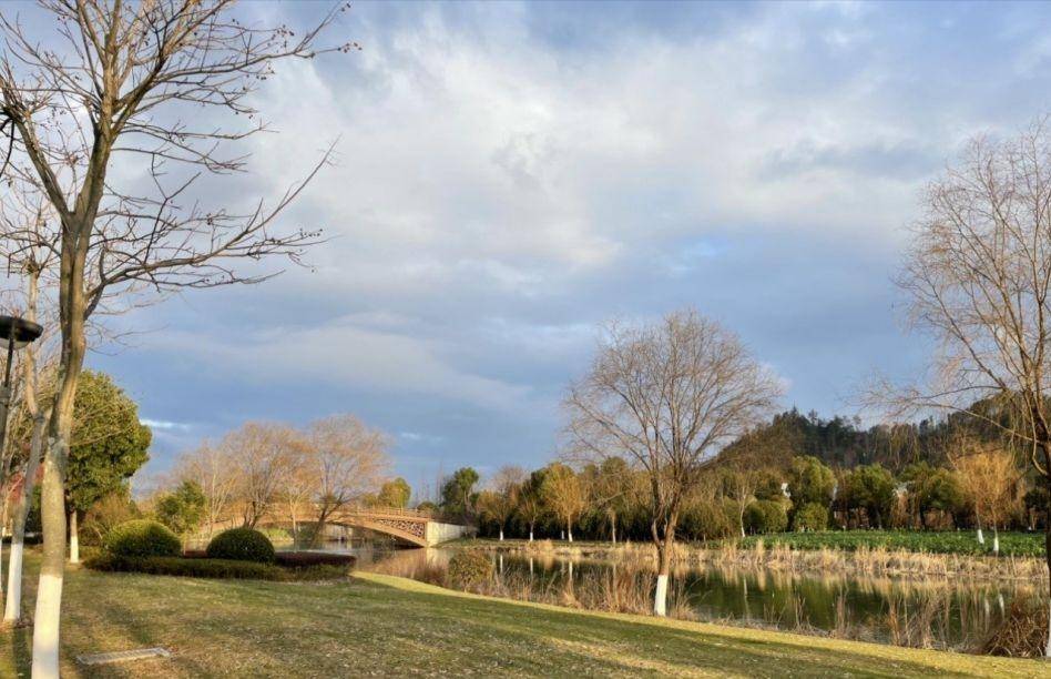 时而水里的鱼一个翻身,溅起一大片水花。沿湖而走,只见树上不时抖动几下,传出几声鸟叫。树下石头做的小拱桥、