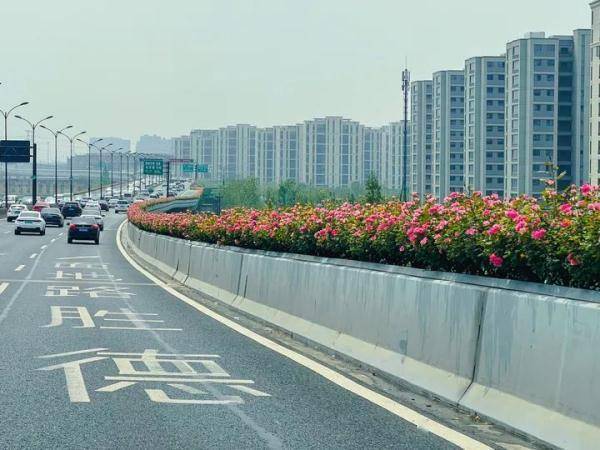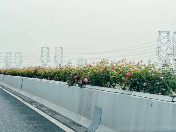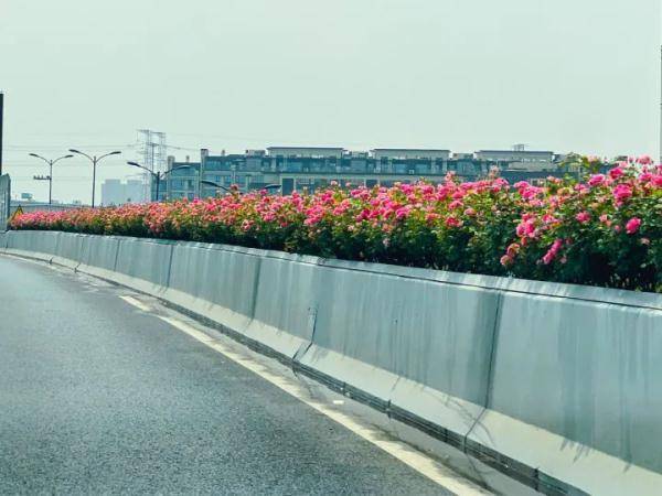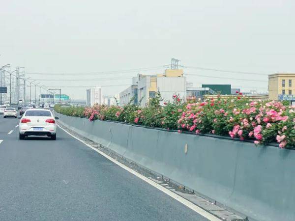 杨女士途经德胜高架、东湖高架和望梅高架,都能够看到绽放中的月季花。在东湖高架转望梅高架的匝道附近,还看到了一些高架养护工人正在往高架的护栏上摆放盛开的月季花。