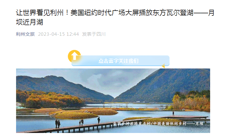 昨天看到,利州文旅发了一个消息:让世界看见利州!美国纽约时代广场大屏播放东方瓦尔登湖——月坝近月湖。