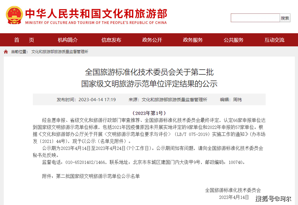 从官网获悉,近日,全国旅游标准化技术委员会发布关于第二批国家级文明旅游示范单位评定结果的公示。