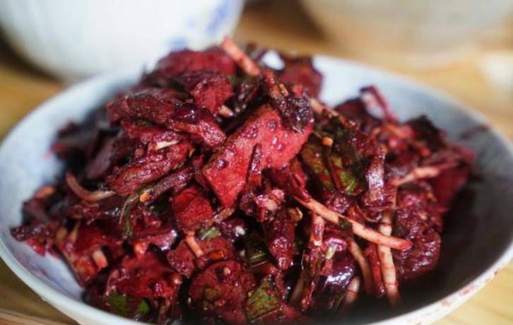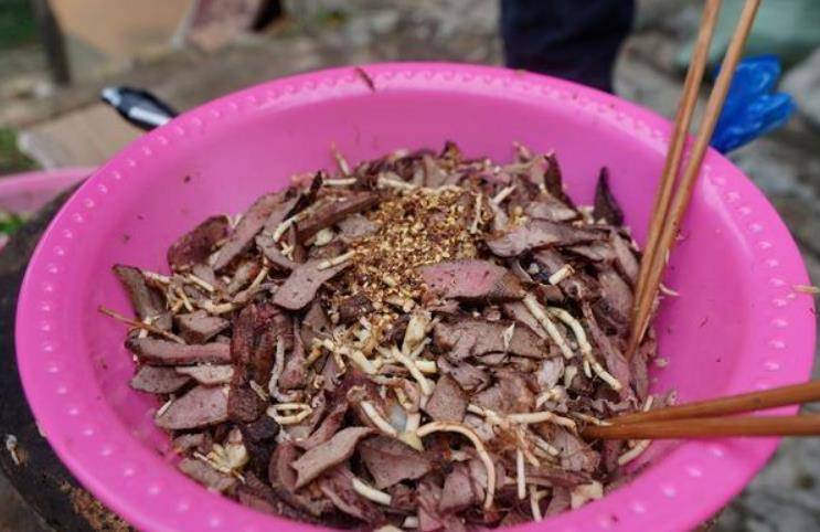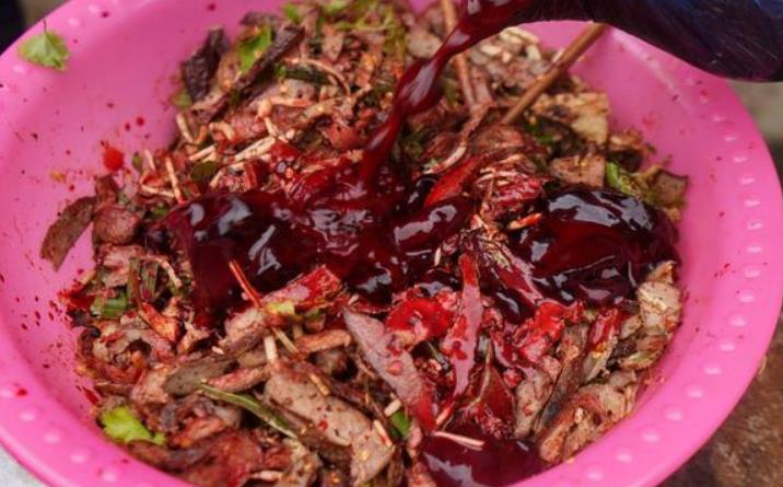 用鲜猪血搅拌之后的血红肉,就成了名副其实的重口味小吃,80~90%的外地人是无法接受这种小吃的,而当地的男女老少都喜欢吃。