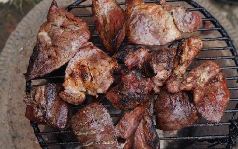 血红肉之所以被人称之为重口,是因为有的人看都不敢看,用的食材就是普通的猪肉鲜食,放在炭火上烤到七八成熟之后切成薄片,烤到7~8成熟的猪肉非常的鲜嫩,经过烤制也没有肉腥味。