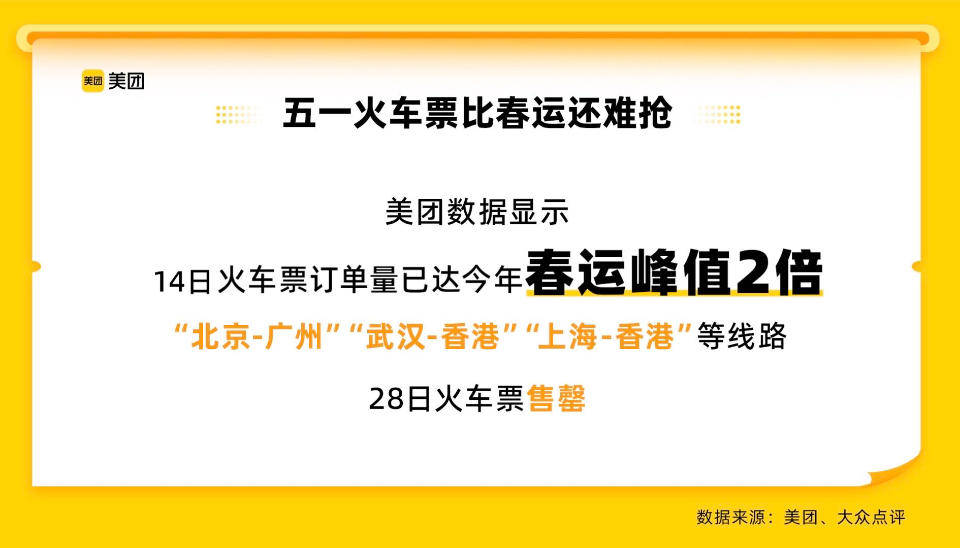 五一火车票卖爆了!美团数据显示,14日火车票订单量已达今年春运峰值2倍。凭借烧烤出圈的淄博再成顶流,火车票搜索增幅位居全国第一,五一假期首日“北京南-淄博”火车票开售1分钟即售罄。