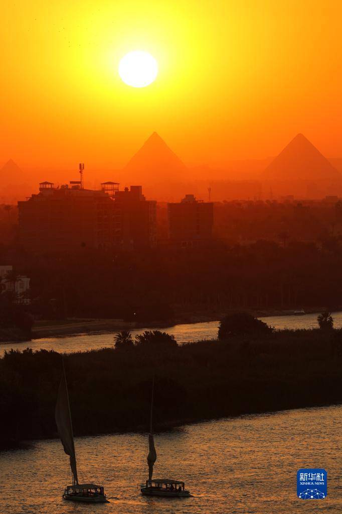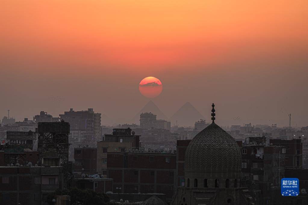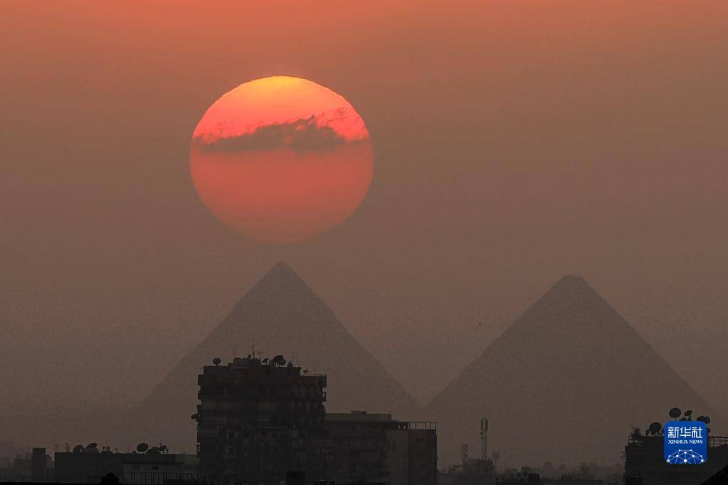 这是4月15日在埃及开罗拍摄的吉萨金字塔群日落景色。新华社记者 隋先凯 摄