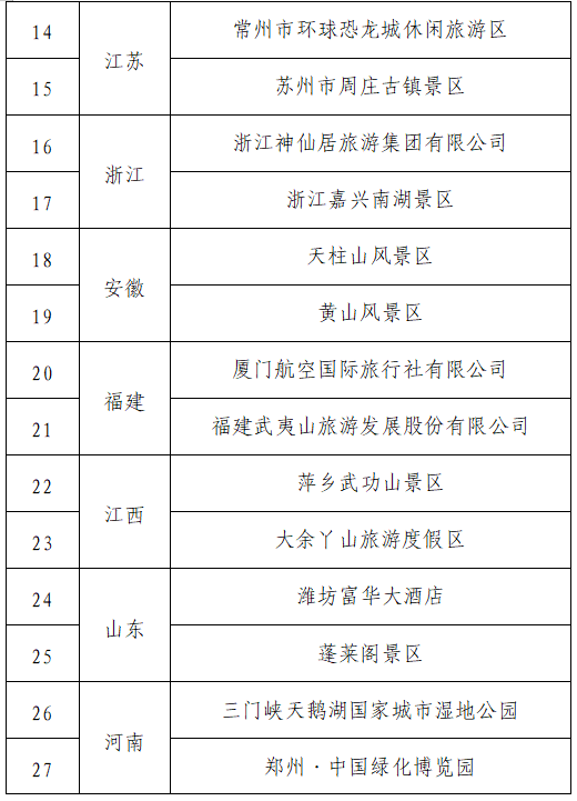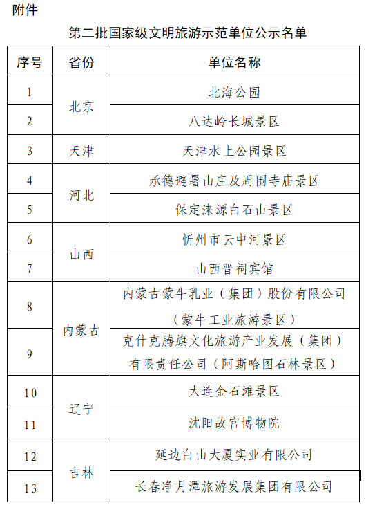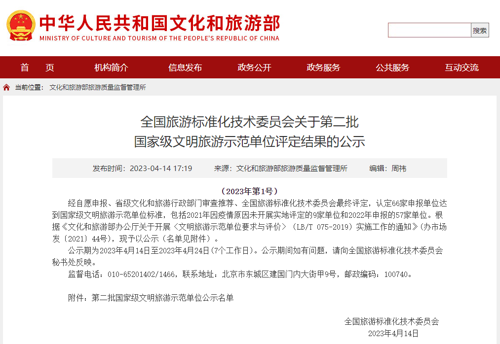 经自愿申报、省级文化和旅游行政部门审查推荐、全国旅游标准化技术委员会最终评定,认定66家申报单位达到国家级文明旅游示范单位标准,包括2021年因疫情原因未开展实地评定的9家单位和2022年申报的57家单位。根据《文化和旅游部办公厅关于开展〈文明旅游示范单位要求与评价〉(LB/T 075-2019)实施工作的通知》(办市场发〔2021〕44号),现予以公示(名单见附件)。