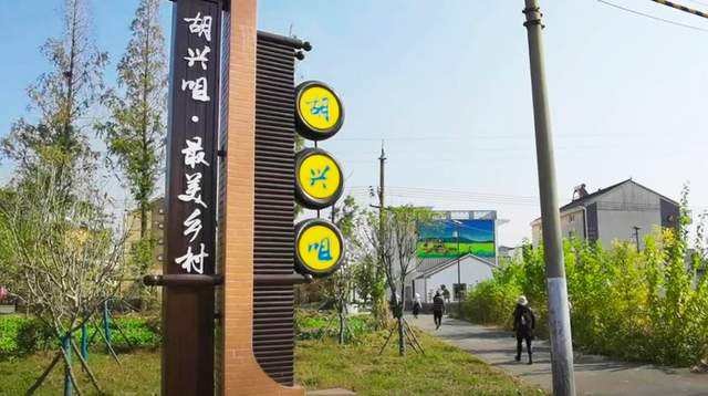 走乡道,穿过小路,跟着路牌指引,很快就会看到胡兴咀的入口指示牌。这是一座改造新颖的现代化最美乡村,主轴的马路不宽,但修筑规整,铺好了水泥,也有路牌和电线杆,行道树尤其茂盛。从远处看,村落的建筑掩映在绿树里,偶尔还能听到鸟叫的声音,骑着电瓶车的村民来回路过,在池塘、田地和树林的景色里反复,一点也不觉得疲倦。胡兴咀村口建了形象雕塑,木制架构、高度有好几米,复古风格,毫无违和感。