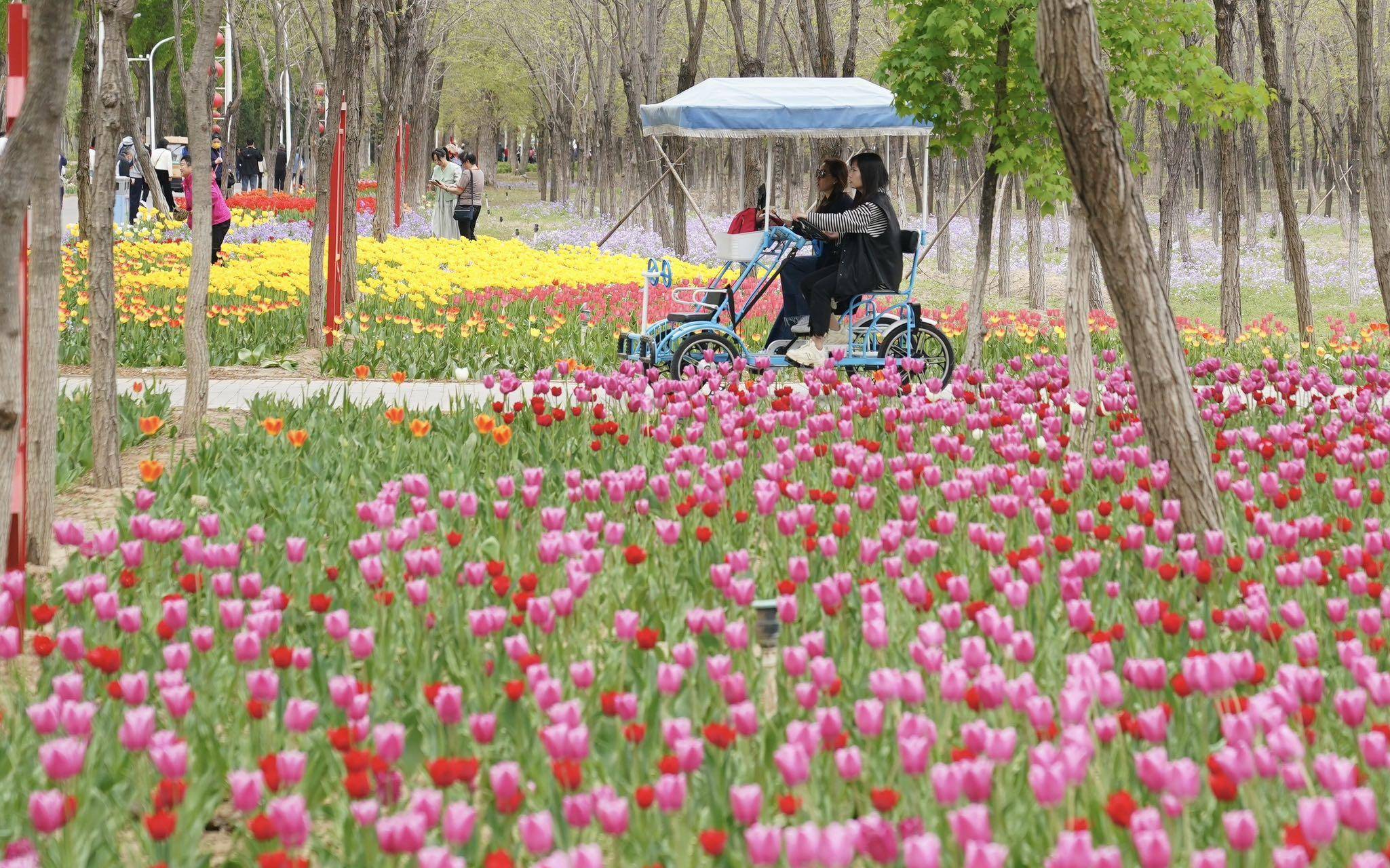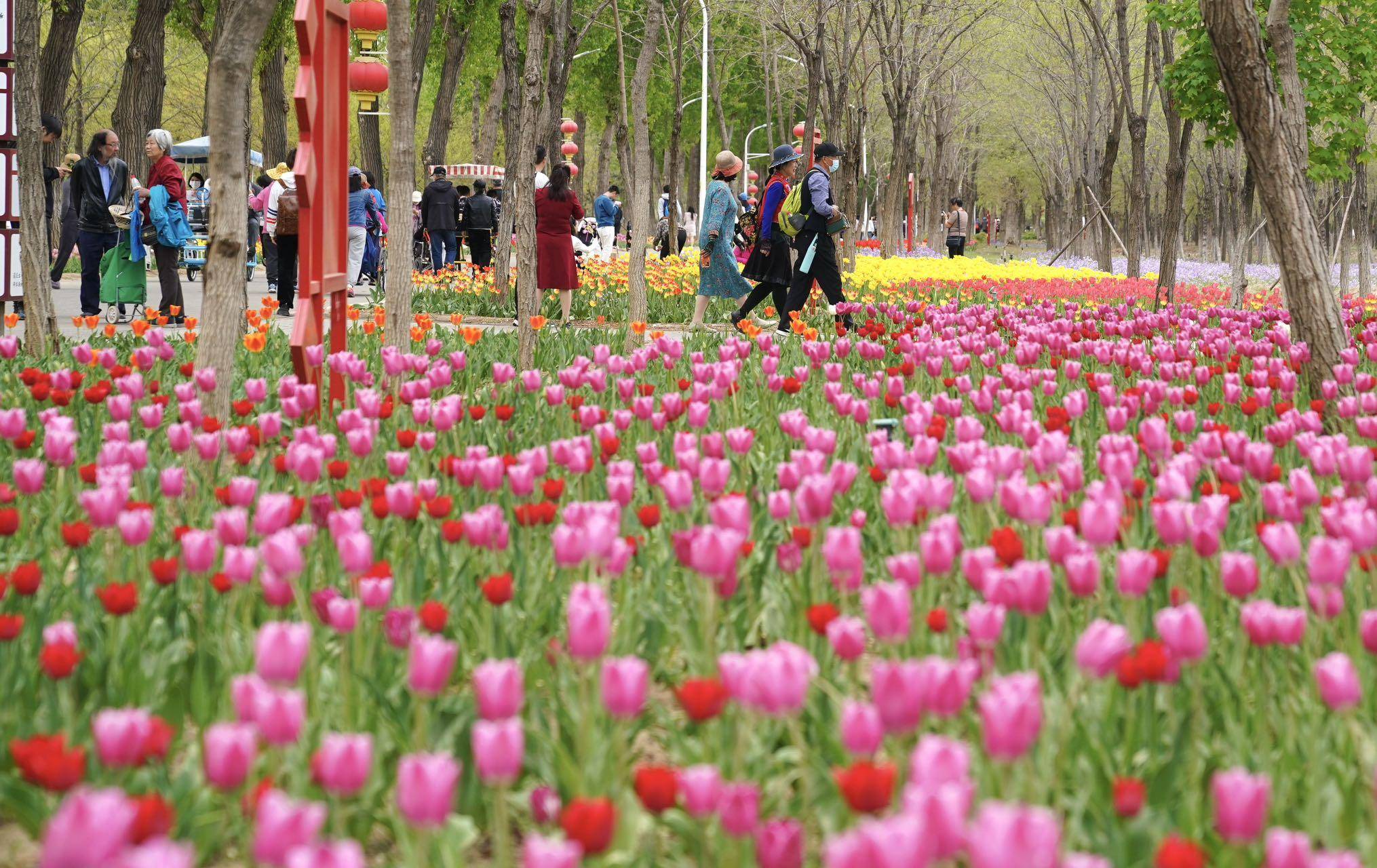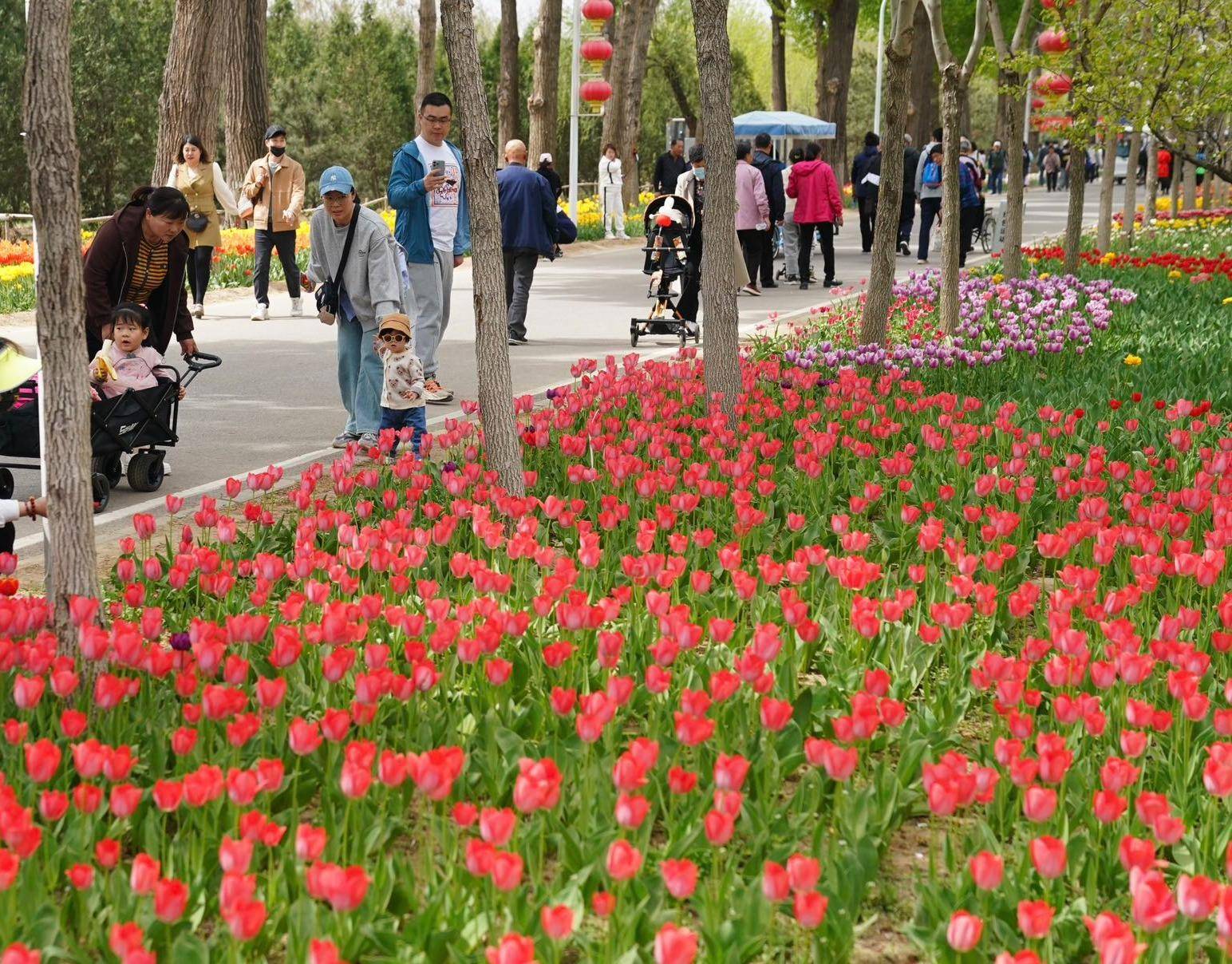 4月16日,大兴区北臧村镇举行的北京市2023年永定河绿色港湾郁金香文化节吸引了大批市民赏花踏青。