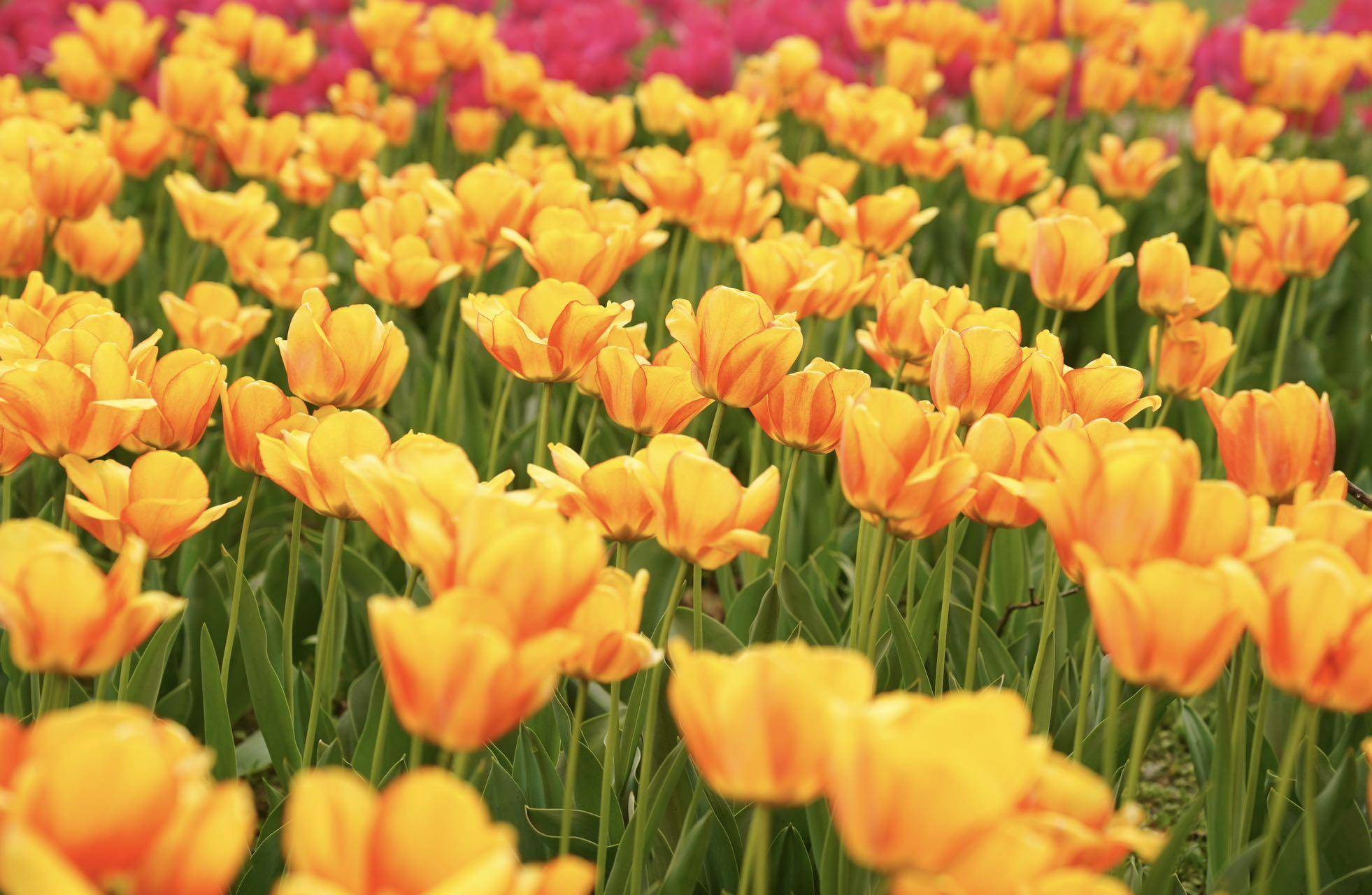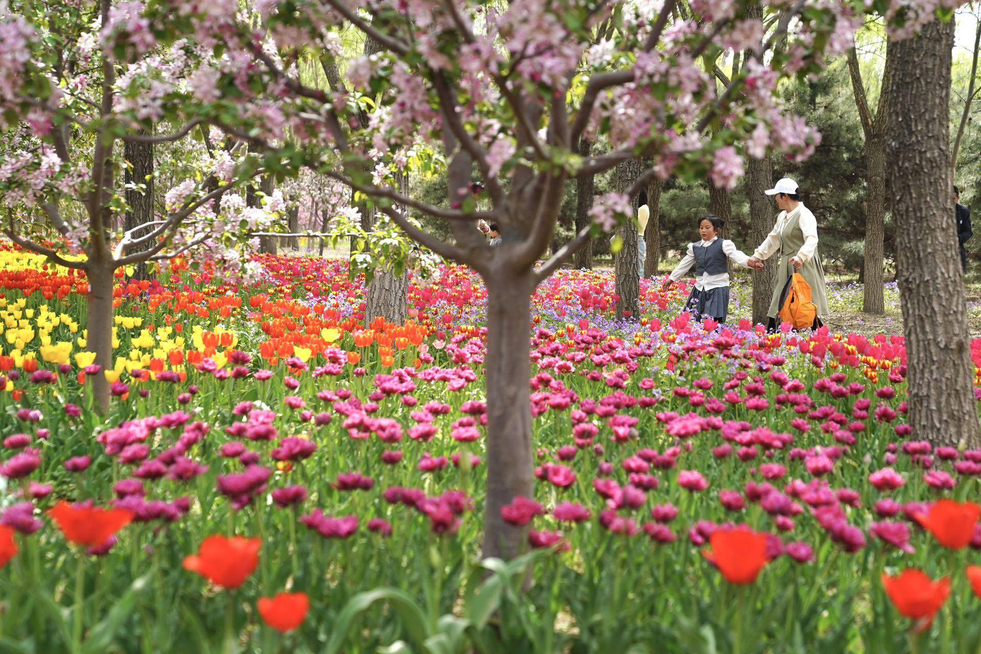 永定河畔的绿色港湾被鲜花簇拥,56种100余万株郁金香争妍斗艳,牡丹、芍药、连翘等各式花卉竞相开放,游客徘徊其间宛如游弋在七彩花海。