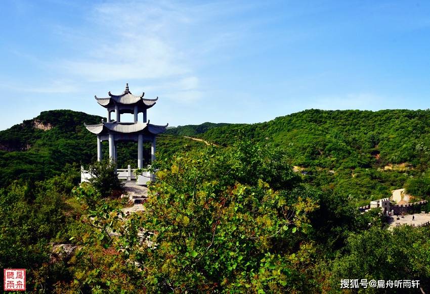 从新中镇出发,沿巩义的南山旅游通道,驱车向东南方向的海拔800米广场行进,过了界岭村,看到左前方出现一座牌楼,上刻“里仁古寨”,就可以毫不犹豫地拐上去。盘山路走上10分钟,远远地便看见山角处的这座伴云亭,就到了。