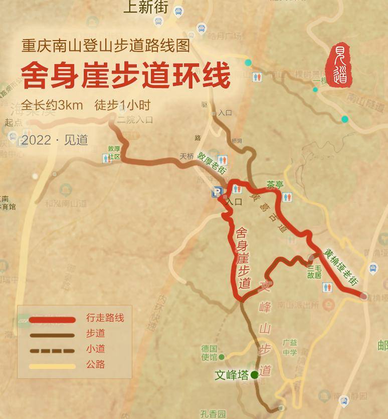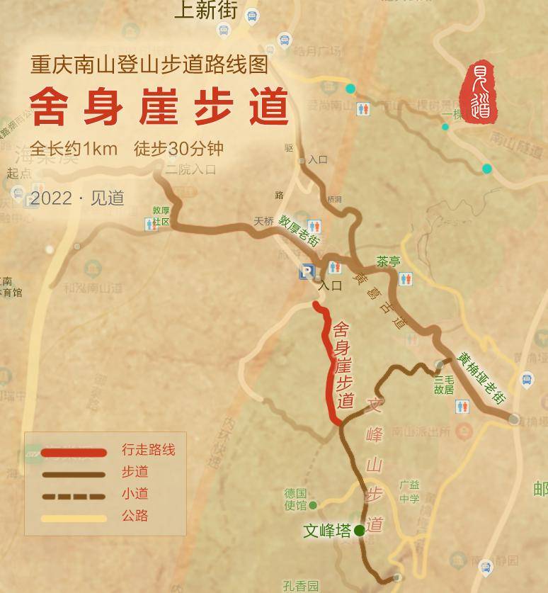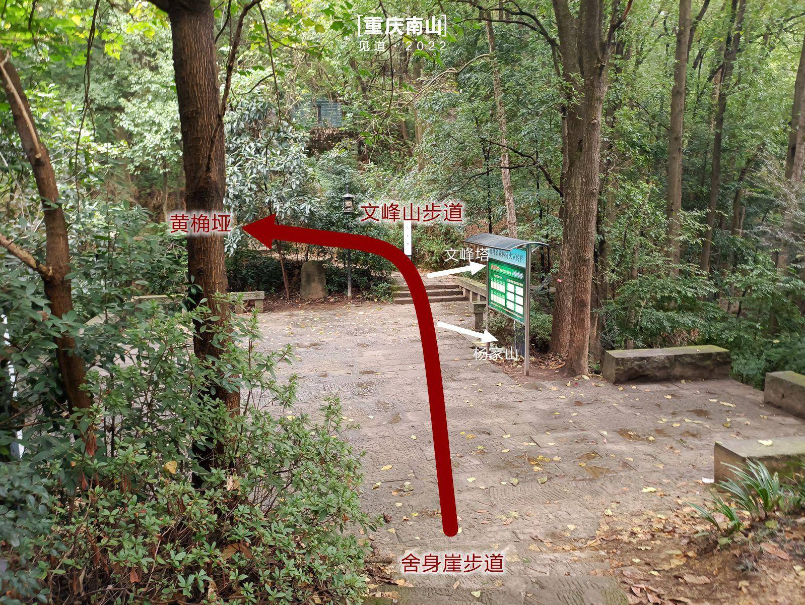 舍身崖步道续接文峰山步道里的一段,可组成一个完整的登山线路。终点为黄桷垭老街。