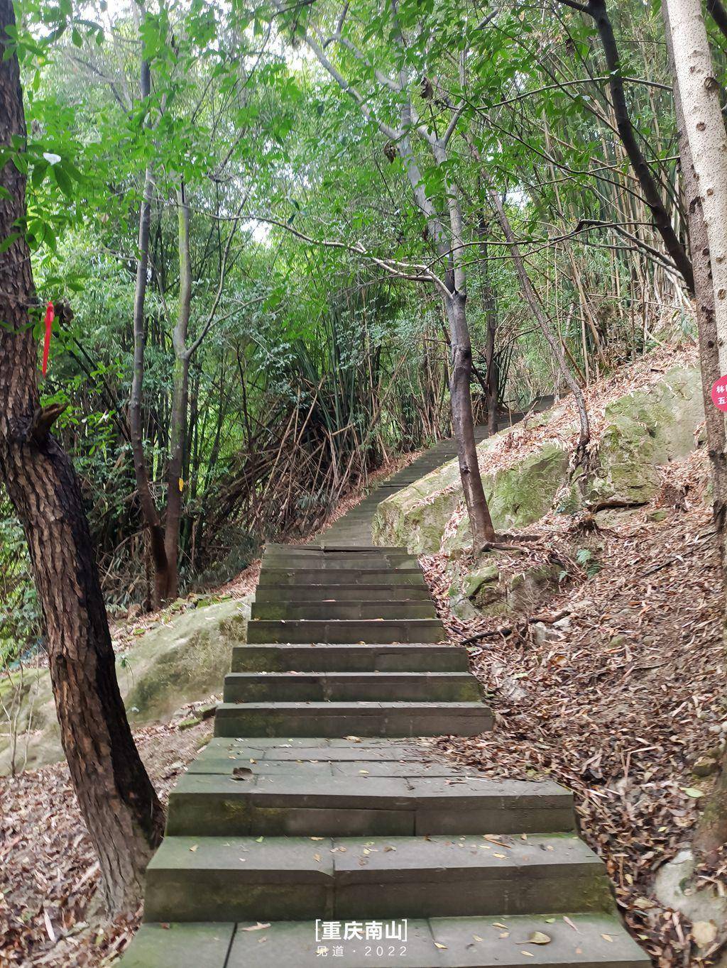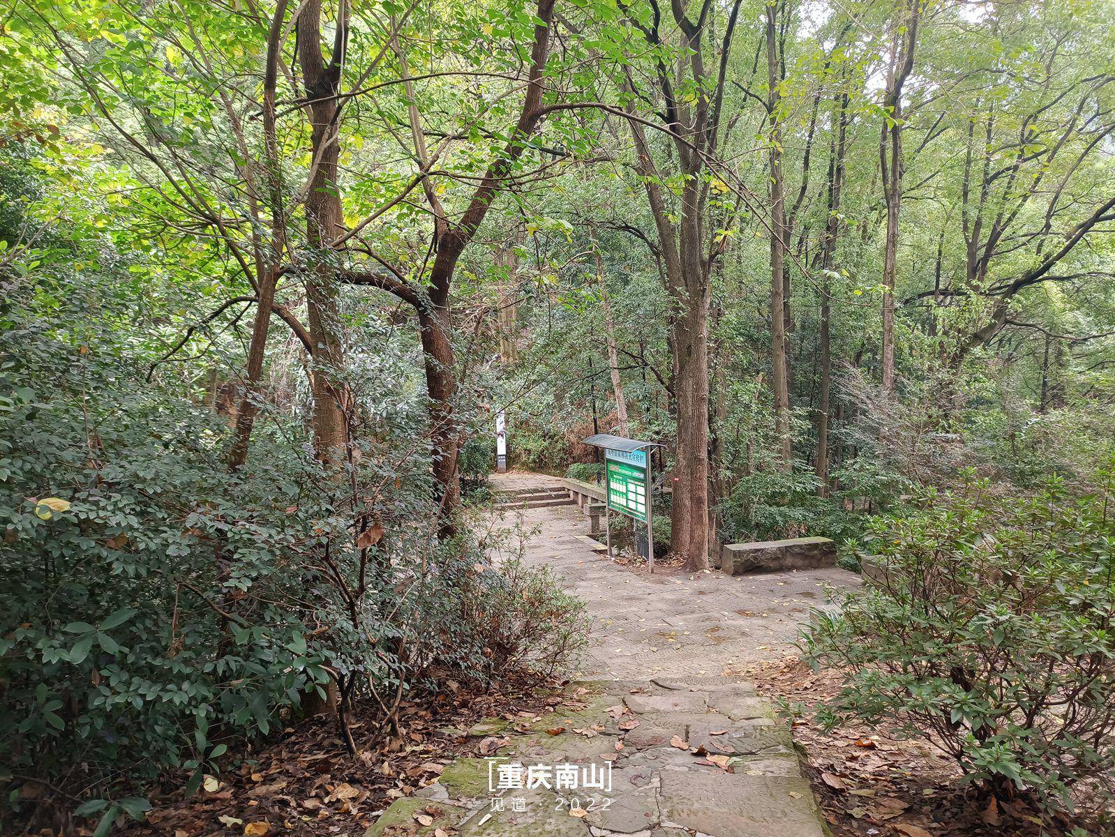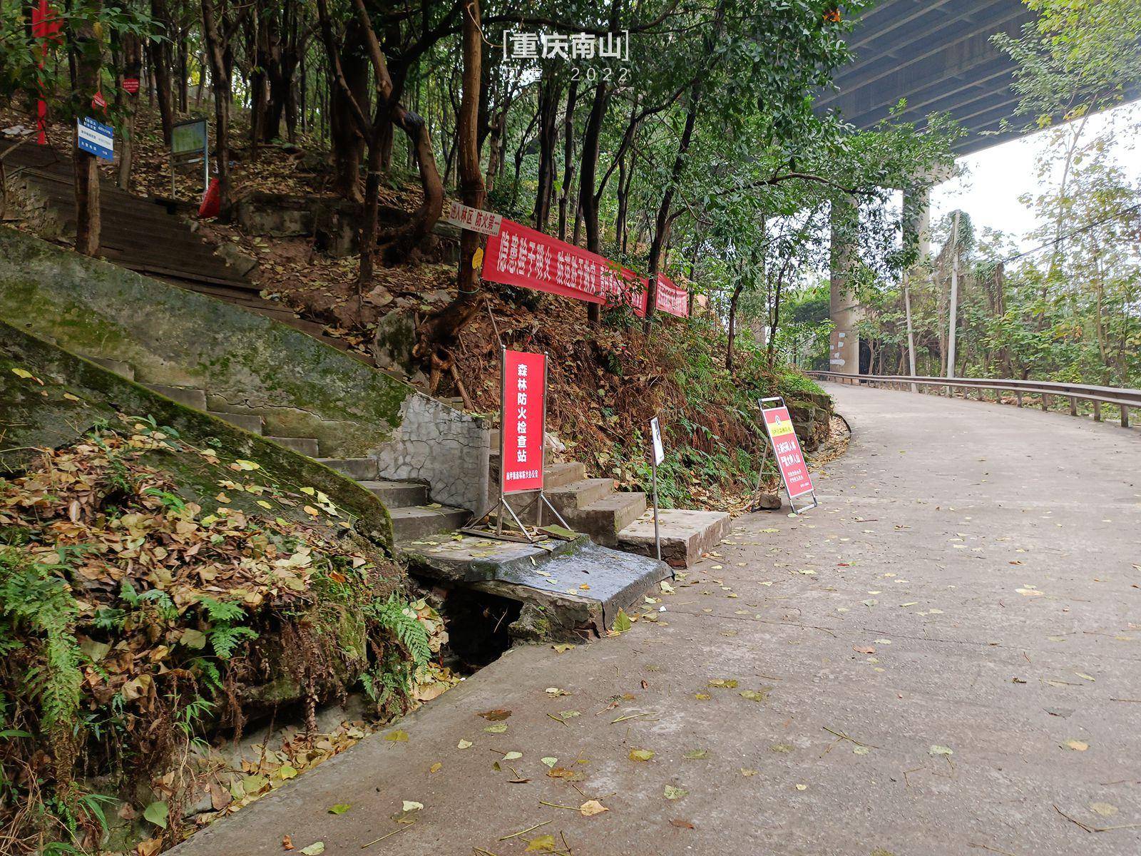 从上新街三岔路口沿前驱路走一公里左右,在过了黄葛古道临时停车场不远处,路左侧有一护林站,旁边有水泥台阶上山。