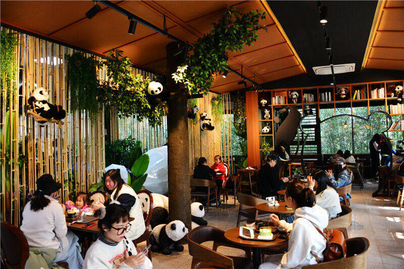 2023年3月28日,北京,年轻人在北京动物园大熊猫馆二楼的熊猫咖啡店就餐。