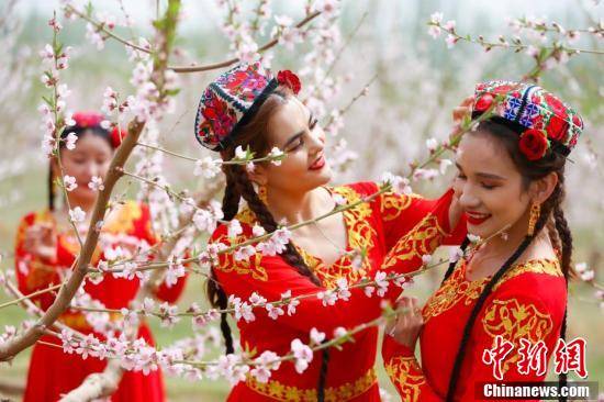 新疆古丽们在桃树下互相簪花。买赛地·买买提明 摄