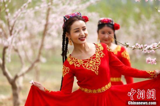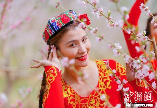 近日,新疆和田地区洛浦县恰尔巴格镇铁提尔巴格村的桃园里桃花盛开,一簇簇粉红的桃花缀满枝头,在青翠欲滴的嫩芽映衬下,更显鲜艳娇美。古丽们结伴春游,在桃树下翩翩起舞,与桃花相映成趣,尽显春的美丽与活力。图为一位新疆古丽将桃花簪在耳间。买赛地·买买提明 摄