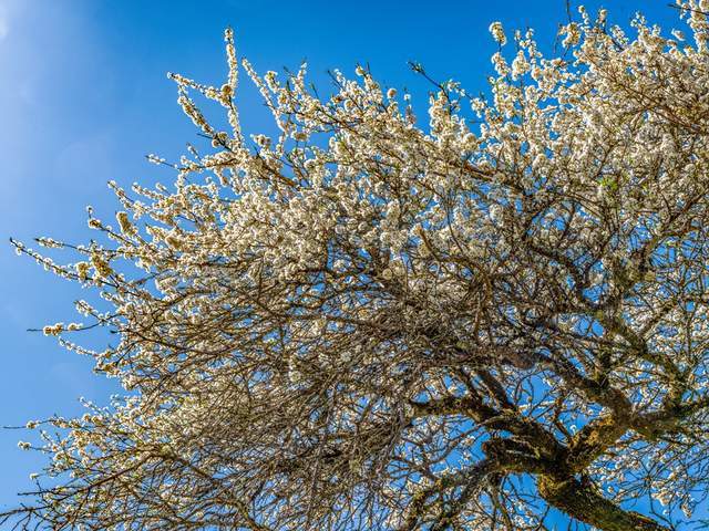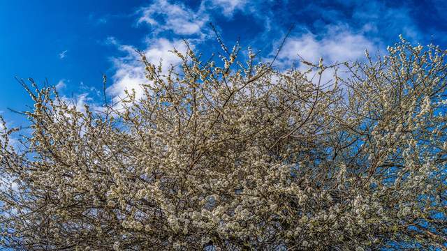 一望无际的高山草甸上,雪白的野李子花装饰着整棵整棵的大树,叶子还没有长出来,花簇一团一团的,像无数个小雪球挂满了枝头,整棵树都是洁白,远远望去,就像一朵朵白云在山间停留......徜徉在野李子花的海洋中,只见在虬曲的枝条上,雪白的小花朵密密麻麻,一簇簇一串串的静静地开放着。有的低垂着脸颊,羞涩地藏在树冠大伞之下;有的挺直了花枝直冲蓝天,骄傲地冲着你微笑;有的却像调皮的孩子,躲在茂密的枝条之间,默默看着你......满眼的白色纯洁而美好,总让人陶醉。