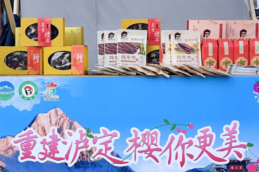 另一边的泸定集市汇聚了红花椒、雪山大豆、明信片、雪糕等泸定特色美食、文创产品,各个摊位前都是人头攒动,大家不时发出赞叹之声,惊艳于泸定的无穷魅力。