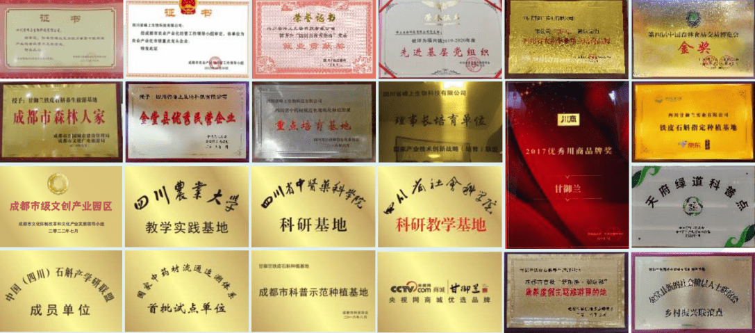 甘御兰铁皮石斛所含的生物碱、多糖、氨基酸的种类和含量与野生的基本相近,其铁皮石斛主要有效成分“多糖”含量可达66.03%,远高于《中国药典》规定的25%。甘御兰铁皮石斛曾入选“央视网商城优选品牌”、荣登2017川商品牌榜,甘御兰石斛林盘景区成功入选为成都3A级林盘景区。
