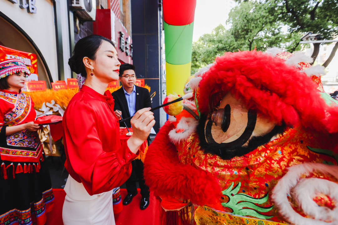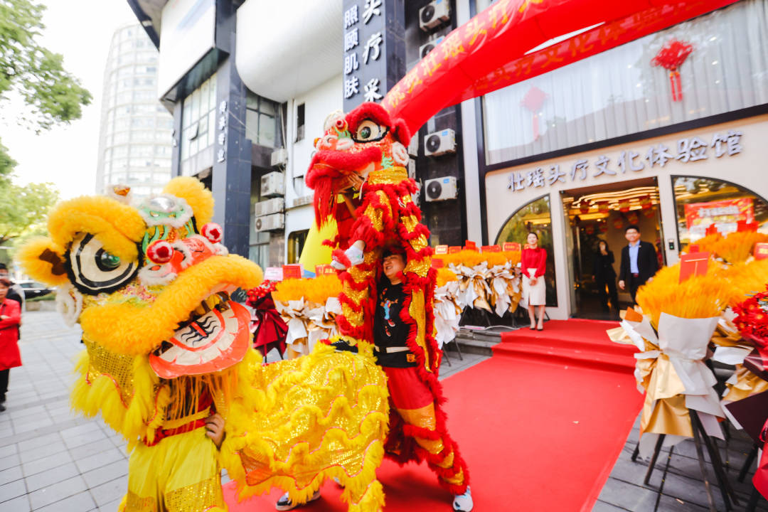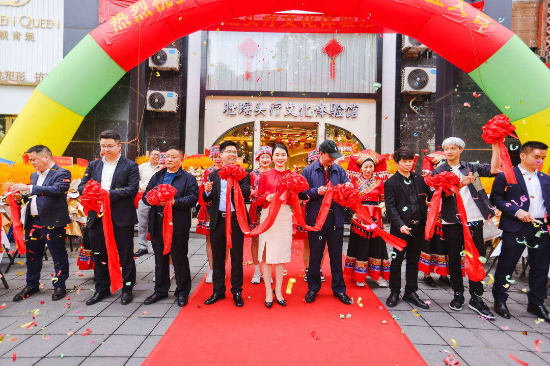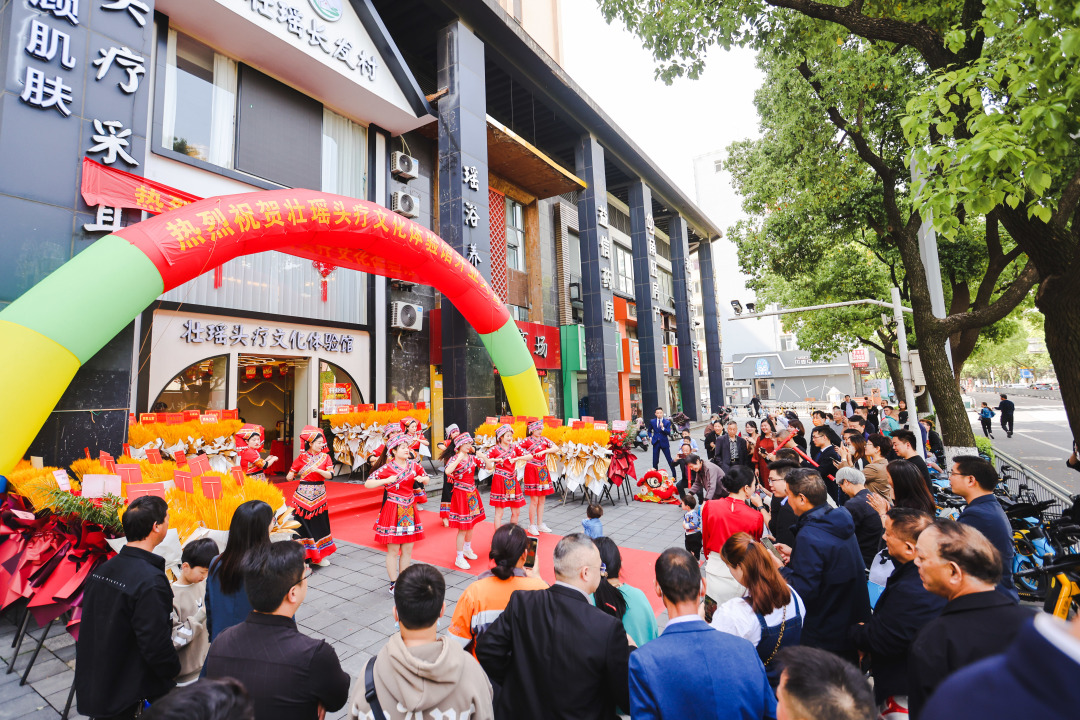 开业当日早上,门店早已被闻讯赶来排队的观众们挤满,期待共同见证这一神圣的庆典时刻。开业典礼在舞狮表演、瑶族文化展示和瑶族特色头疗文化体验馆的剪彩仪式完成后,全场的气氛也被推向了高潮。