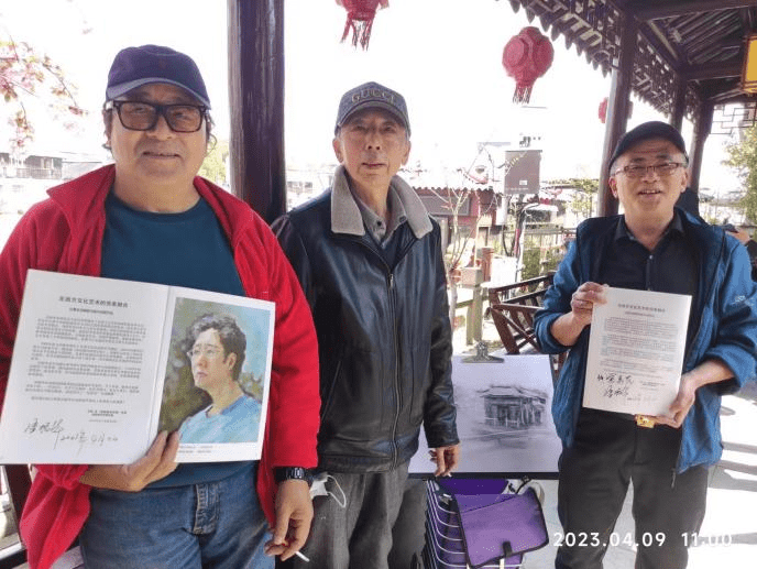 上图为:著名油画大师方世聪与著名钢笔画家汪伟民和著名油画家冯振华在朱家角古镇学术交流。