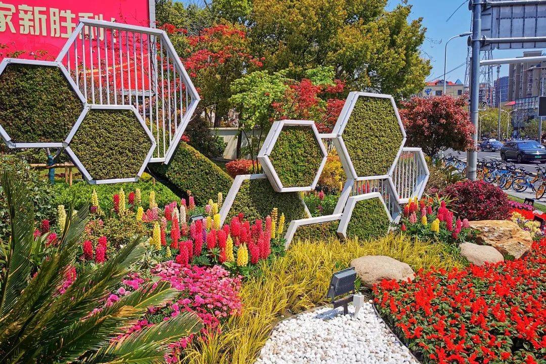 宝杨路牡丹江路口、宝杨路同济路口布置两处主题景点1000平方米。全路段主要节点共布置花境800平方米。