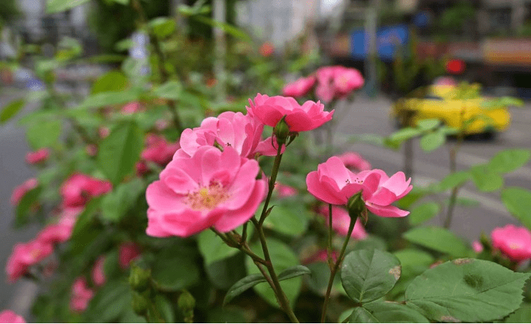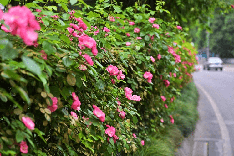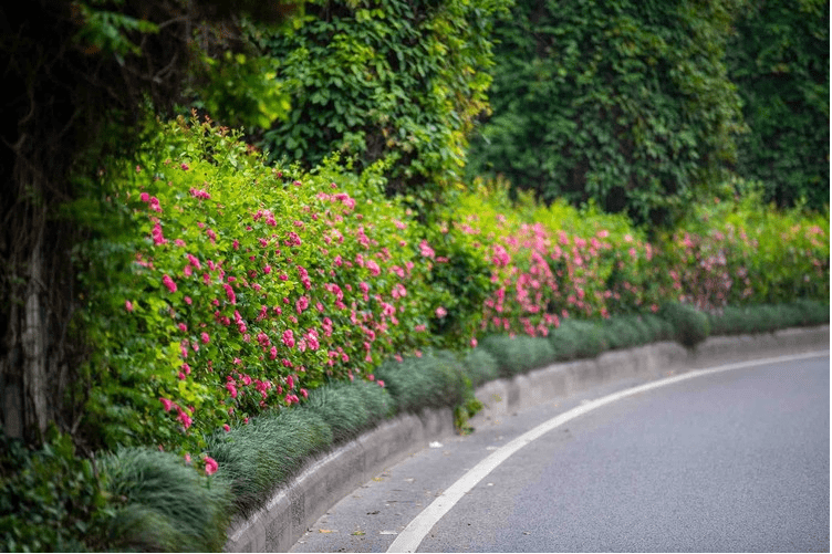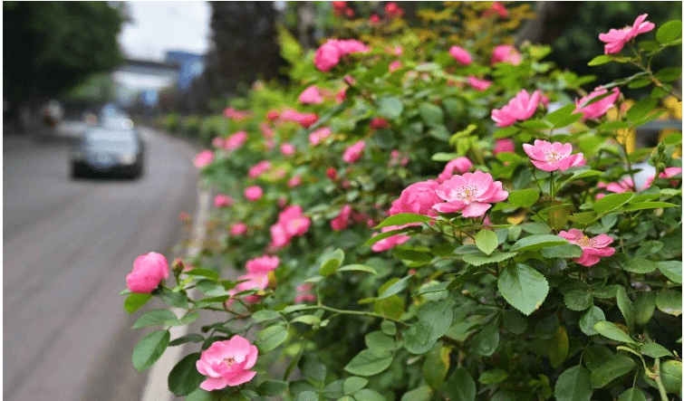 在龙泉路上,藤本月季吐蕊绽放,顺着道路绵延近4公里,形成一条鲜花大道,让人尽情感受着“路上的春天”。