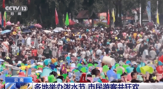 在西双版纳,数万名游客和当地群众聚在景洪市泼水广场泼水狂欢。广场上人头攒动,水花四溅,欢呼声夹杂着水声,气氛热烈。