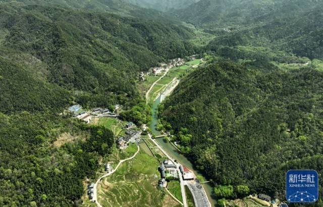 九岭山环抱中的港背村(4月7日摄,无人机照片)。新华社记者 万象 摄