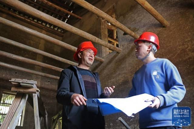 施工人员在村里的老屋前施工,这里将改建成一处旅游民宿(4月7日摄)。新华社记者 万象 摄