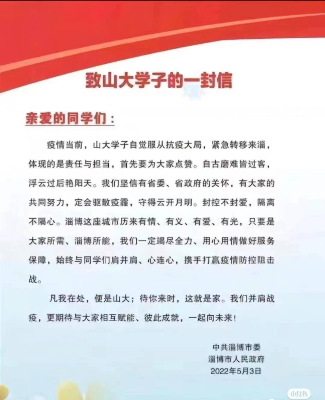 时间倒回到2022年5月3日,山东大学12000名学子因疫情防控需要转移至淄博隔离。隔离是什么滋味,经历过的人足以铭记终生吧,更何况那是来自全国各地的学子。在一个完全陌生的城市淄博,他们受到了家人一般的礼遇。淄博市委市政府在给学子们的信中说“凡我在处,便是山大,待你来时,这便是家”。