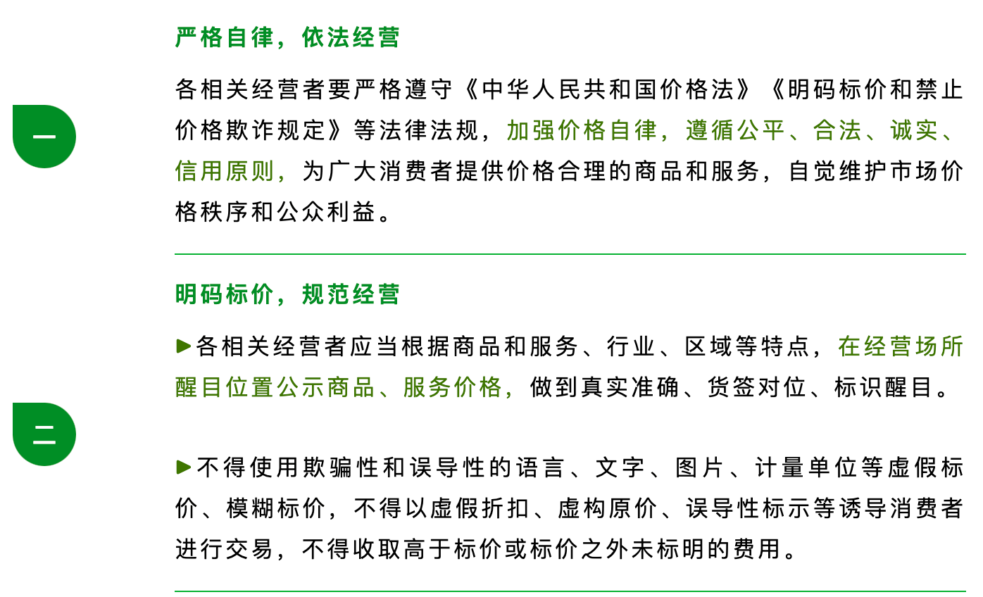 各相关经营者要严格遵守《中华人民共和国价格法》《明码标价和禁止价格欺诈规定》等法律法规,加强价格自律,遵循公平、合法、诚实、信用原则,为广大消费者提供价格合理的商品和服务,自觉维护市场价格秩序和公众利益。