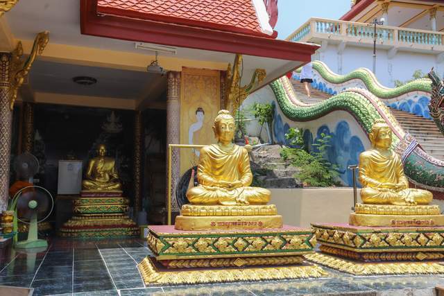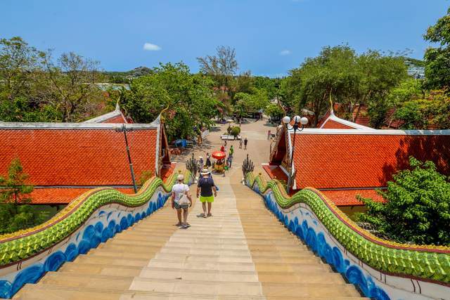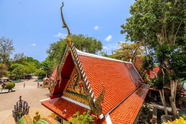 这个寺庙最著名的景点是一个12米高的金色佛像,它坐落在一个宽敞的平台上,可以俯瞰整个海湾和周围的景色。