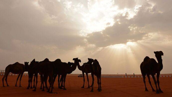 从沙特阿拉伯首都利雅得出发,驾车向北行驶约130公里,抵达代赫纳沙漠腹地塞亚希德。这里是第七届阿卜杜勒·阿齐兹国王骆驼节的举办地,几个月前,世界各地游客和骆驼爱好者慕名而来,再次进入一年一度的“沙漠狂欢”时刻。