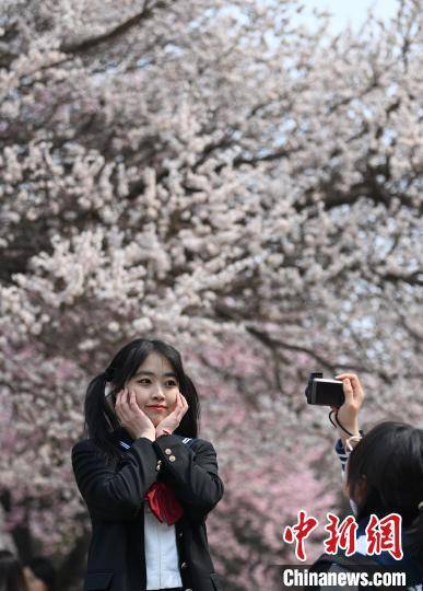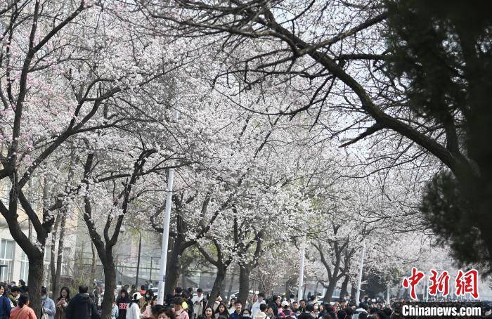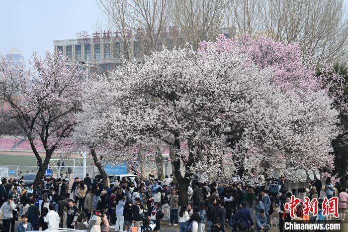4月16日,在吉林大学校园内杏花竞相绽放,汇成粉色海洋,吸引众多市民前来赏花。