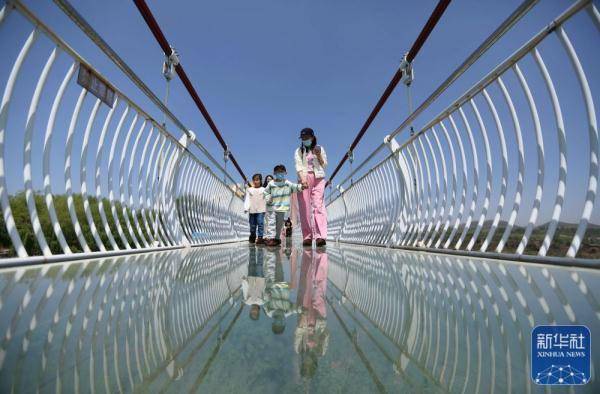 4月16日,游客在沂南县红石寨景区体验高空玻璃吊桥。